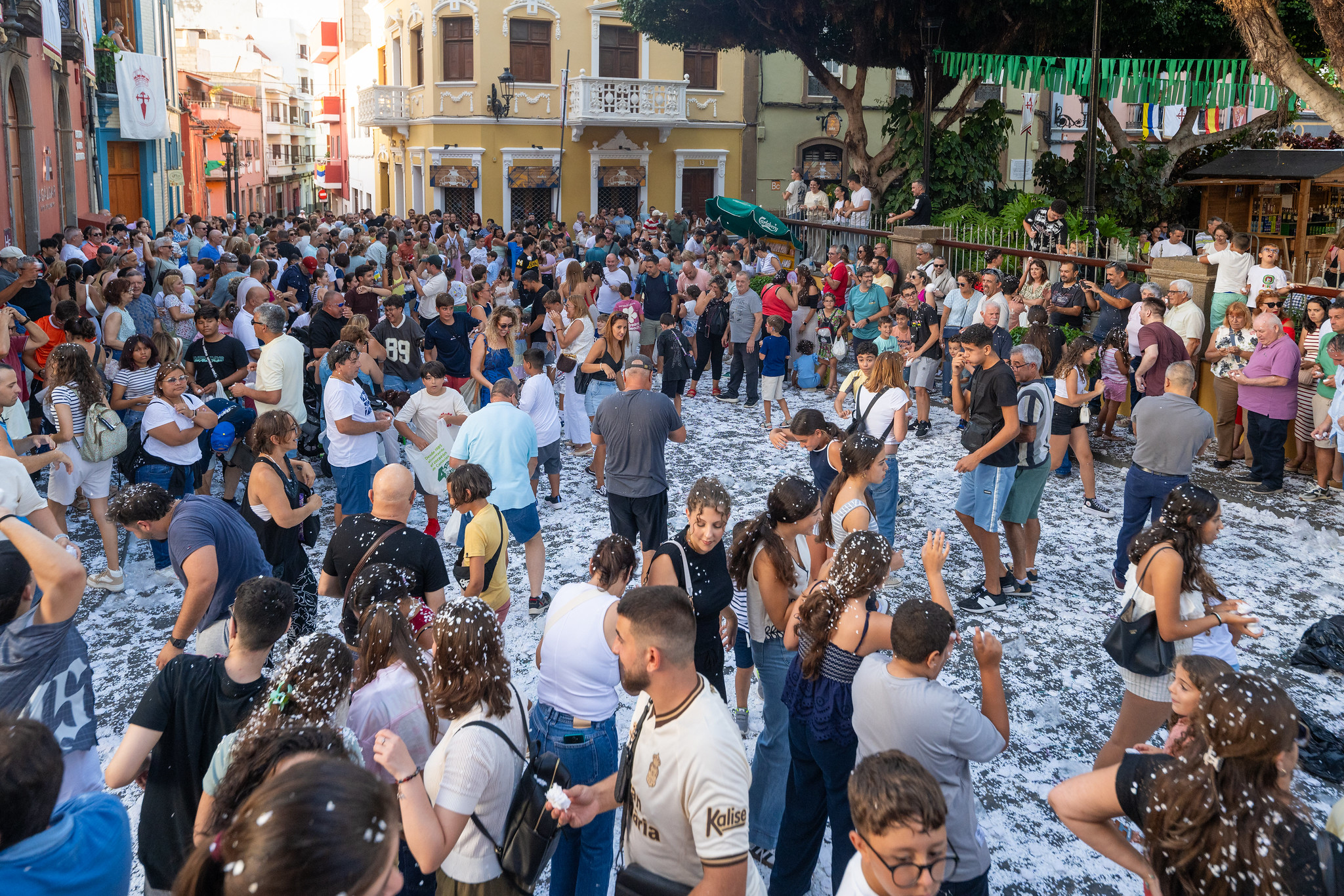 Fiesta para toda la familia de la mano de la tradición, la Batalla de las Flores, una de las citas más esperadas del programa de las Fiestas Mayores de Santiago de Gáldar ha vuelto a convertir los aledaños de la Plaza de Santiago en el particular campo de batalla de la alegría y la diversión para niños y mayores.