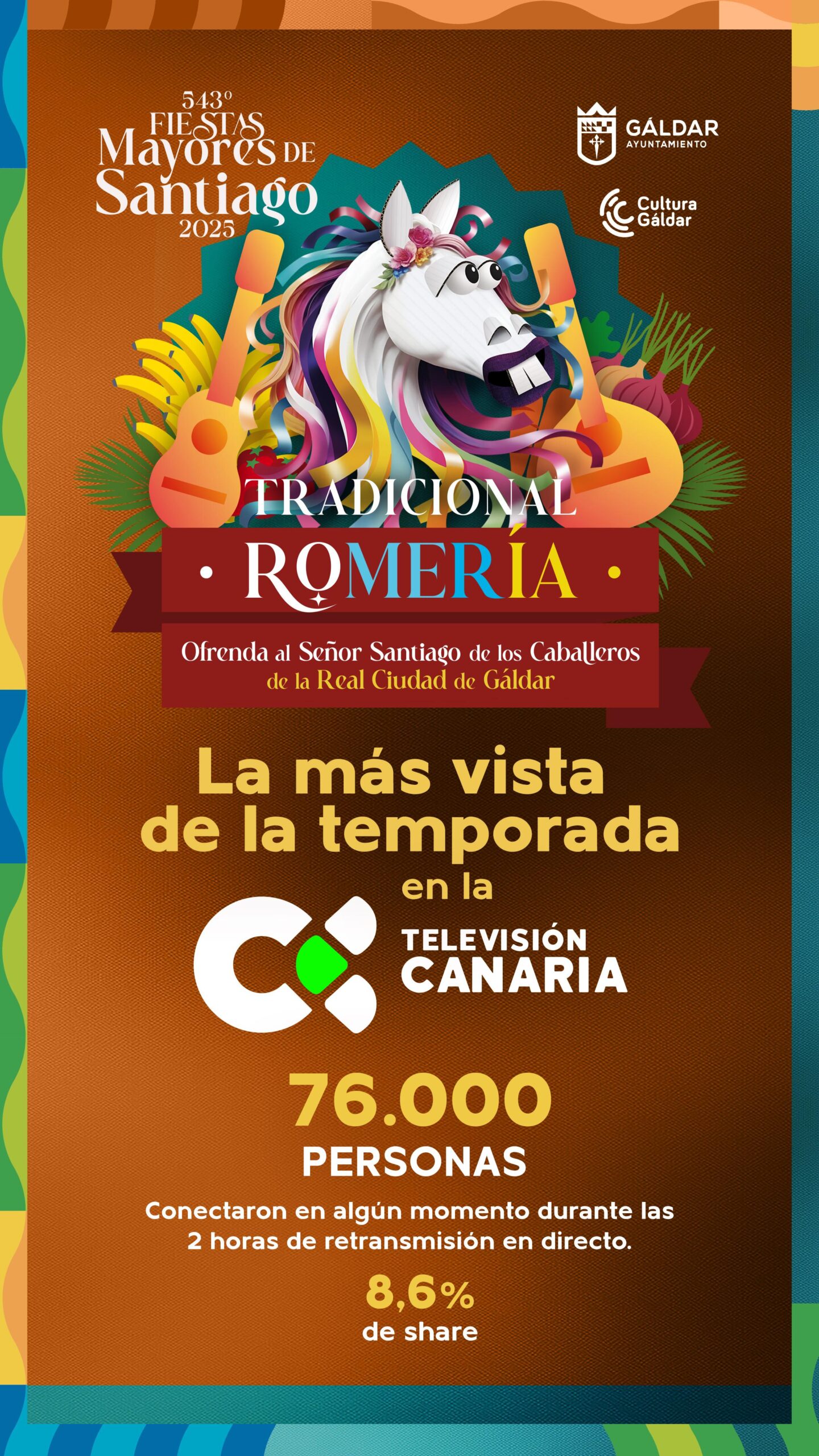 Según datos de Kantar Media hasta 76.000 personas conectaron en algún momento durante las dos horas de retransmisión en directo desde la ciudad de Gáldar para disfrutar a través de sus pantallas del recorrido por el casco histórico de las 38 carretas y 13 agrupaciones musicales que formaron parte de la comitiva, así como del momento de la ofrenda a Santiago a la entrada del Templo Santuario de Gáldar.