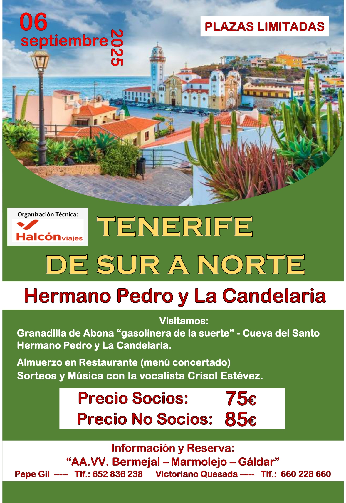La A.V. “El Bermejal” de Marmolejos como en los últimos años organiza un viaje a Tenerife ida y vuelta el mismo día, siendo el mismo el sábado seis de septiembre del presente año 2025.
