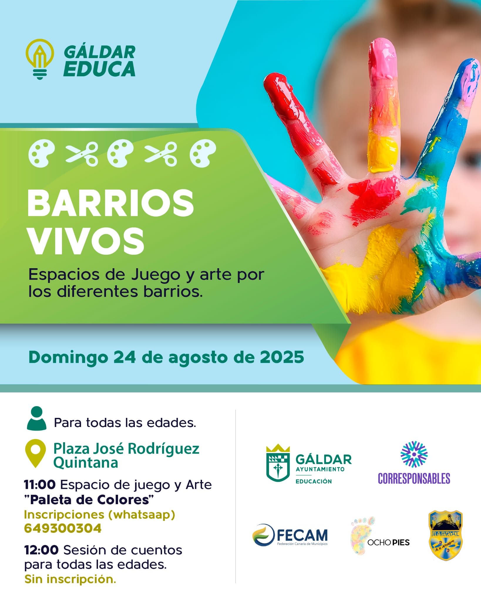 ‘Barrios Vivos’ es una actividad organizada por la Concejalía de Educación dentro del programa Gáldar Educa, con el objetivo de dinamizar la vida de los barrios del municipio. Esta iniciativa se desarrolla en el marco del Plan Corresponsables, con la colaboración de la FECAM y Ocho Pies.