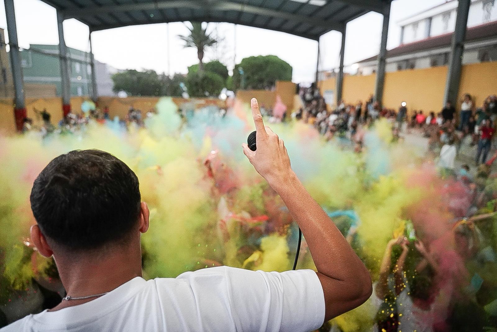 La comisión de fiestas, con Pepe García a la cabeza repartió casi mil bolsas con polvos Holi. El maestro de ceremonias Aithamy D.J indicó cuando era el momento de espolvorearlos; inició la cuenta atrás 3, 2, 1…. y los polvos Holi tiñeron el mencionado recinto, desatándose la locura y la diversión.
