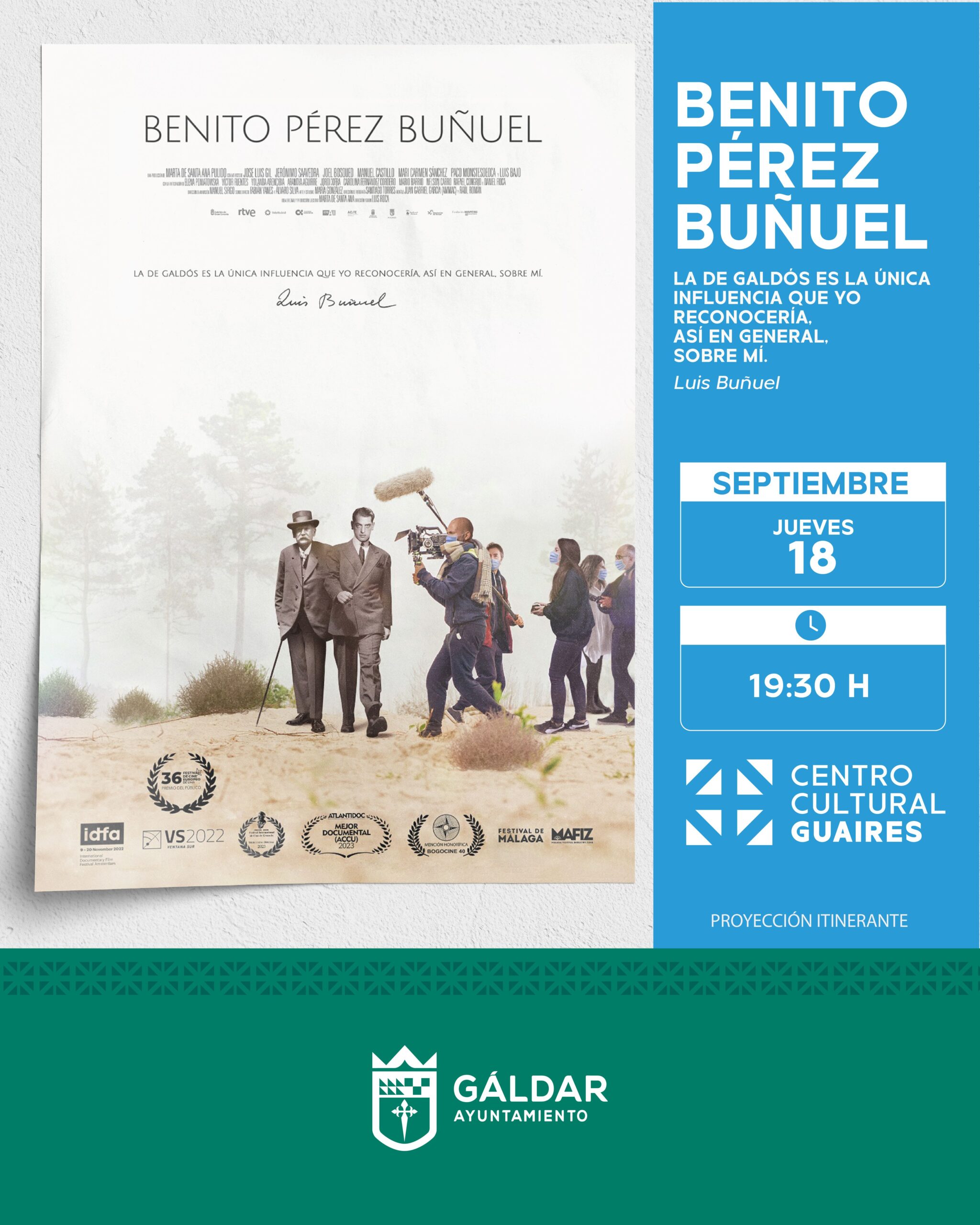 El Centro Cultural Guaires acoge el próximo jueves 18 de septiembre a las 19.30 horas la proyección del largometraje documental ‘Benito Pérez Buñuel’. Se trata de un proyecto que tiene como protagonistas a dos grandes creadores, el escritor Benito Pérez Galdós y el cineasta Luis Buñuel.