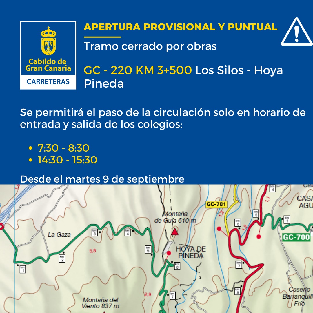 Con motivo del inicio del curso escolar, la Consejería de Obras Públicas del Cabildo de Gran Canaria y el Ayuntamiento de Gáldar informan que, a partir del próximo martes 9 de septiembre, se habilitará el paso de vehículos en dos franjas horarias en el kilómetro 3,5 de la carretera GC-220 (Hoya Pineda – Los Silos), donde actualmente se ejecutan obras de estabilización de muros.