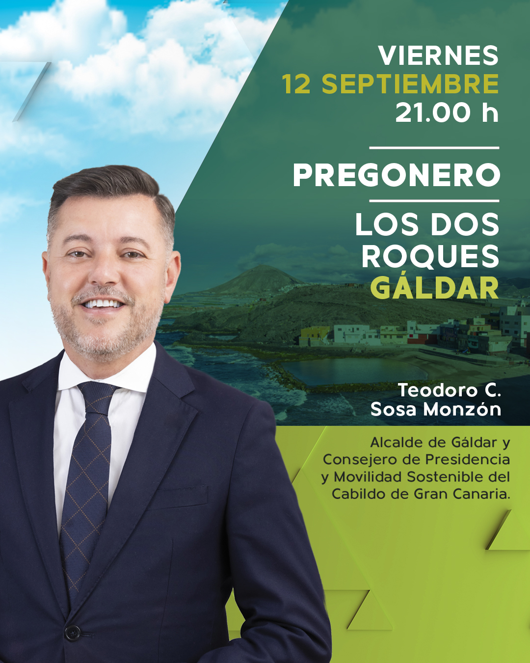 Teodoro Claret Sosa Monzón, alcalde de Gáldar y consejero de Presidencia y Movilidad Sostenible del Cabildo de Gran Canaria, pregonará este viernes las Fiestas en Honor a San Roque, en el barrio costero de Los Dos Roques. El primer edil leerá el pregón este viernes 12 de septiembre a partir de las 21.00 horas en la sede de la Asociación de Vecinos.
