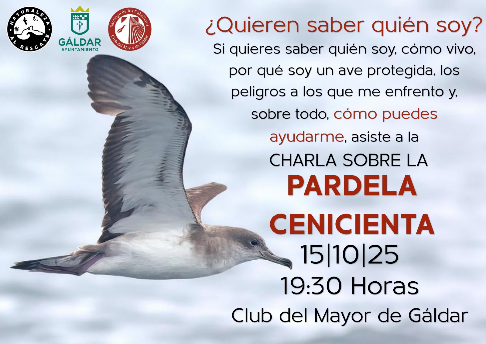 La Concejalía de Medio Ambiente del Ayuntamiento de Gáldar, que dirige Ulises Miranda Guerra, en colaboración con la Asociación Naturaleza al Rescate organiza una charla informativa sobre la campaña de protección de la pardela cenicienta, una de las aves marinas más emblemáticas y protegidas de nuestras costas. El encuentro tendrá lugar el próximo martes 15 de octubre a las 19:30 horas en el Club del Mayor Santiago de Los Caballeros de Gáldar, y está abierto a toda la ciudadanía.