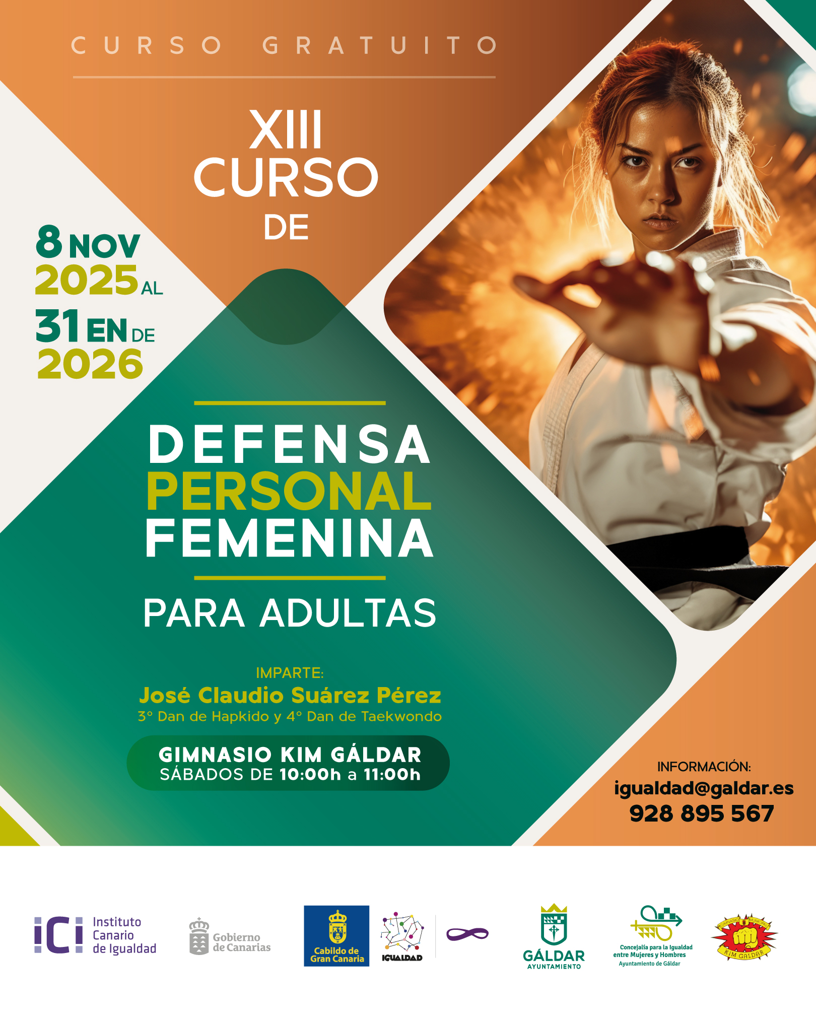 La Concejalía para la Igualdad entre Mujeres y Hombres del Ayuntamiento de Gáldar, que dirige Ana Teresa Mendoza Jiménez, organiza un curso de Defensa Personal Femenina que se realizará del 8 de noviembre al 31 de enero. El curso, que es gratuito mediante inscripción previa, se lleva a cabo en el marco de la programación por el Día Internacional contra la violencia hacia las mujeres.
