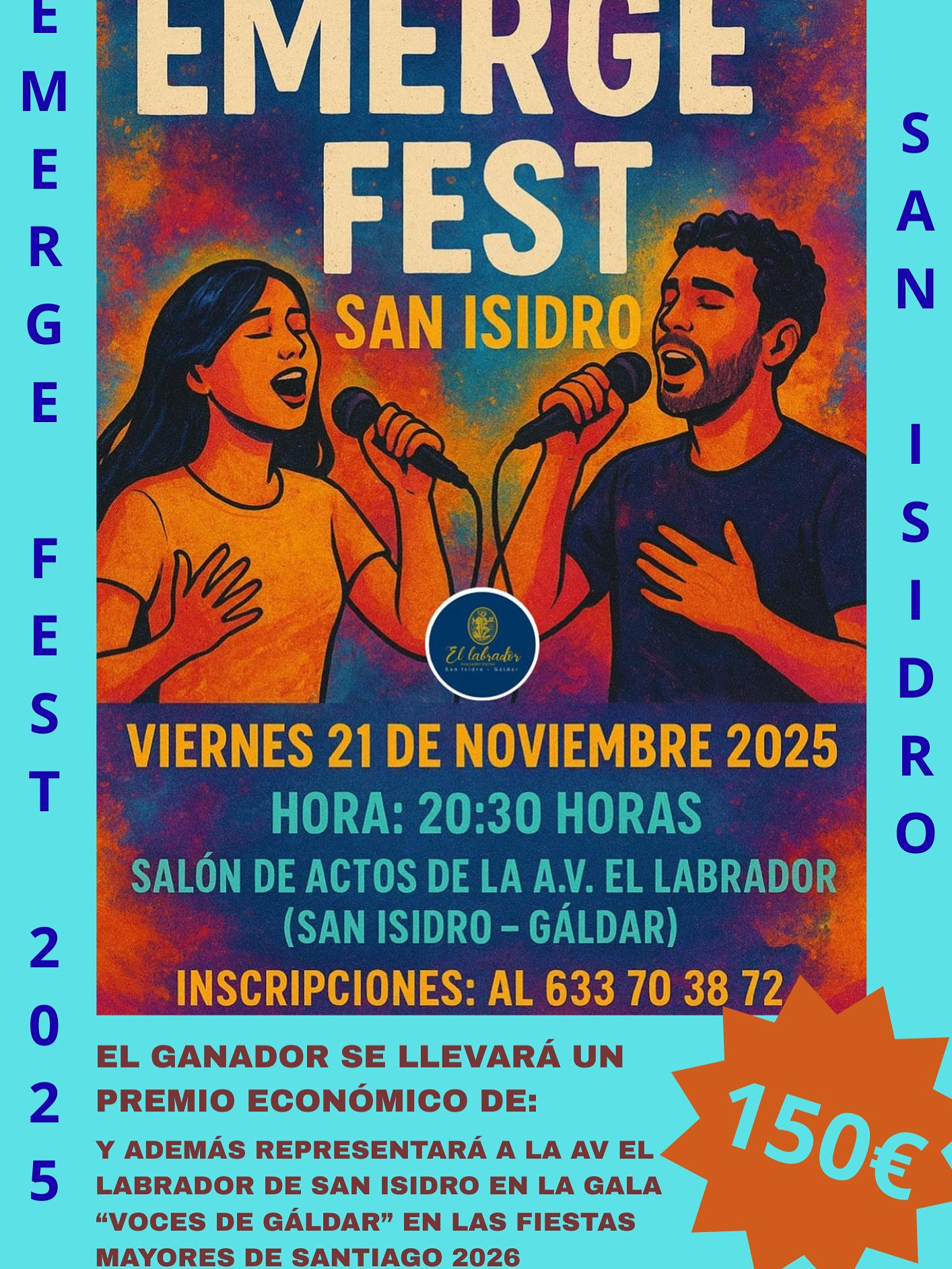 El ganador o ganadora del Emerge Fest no solo se llevará un premio económico de 150 euros, sino que también obtendrá la oportunidad de representar a la Asociación de Vecinos El Labrador de San Isidro en la Gala “Voces de Gáldar”, que se celebrará dentro de las Fiestas Mayores de Santiago 2026.