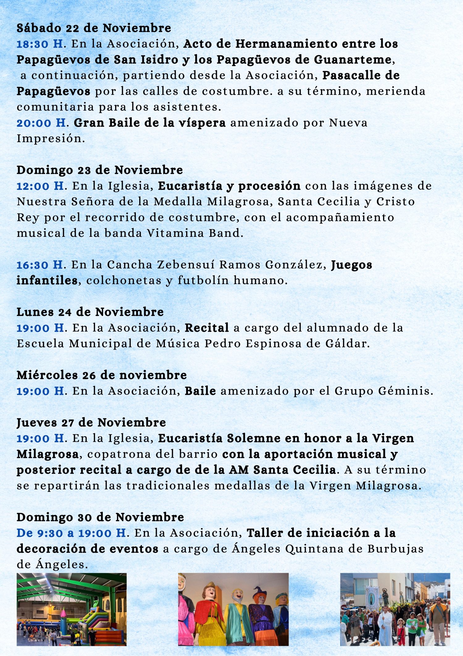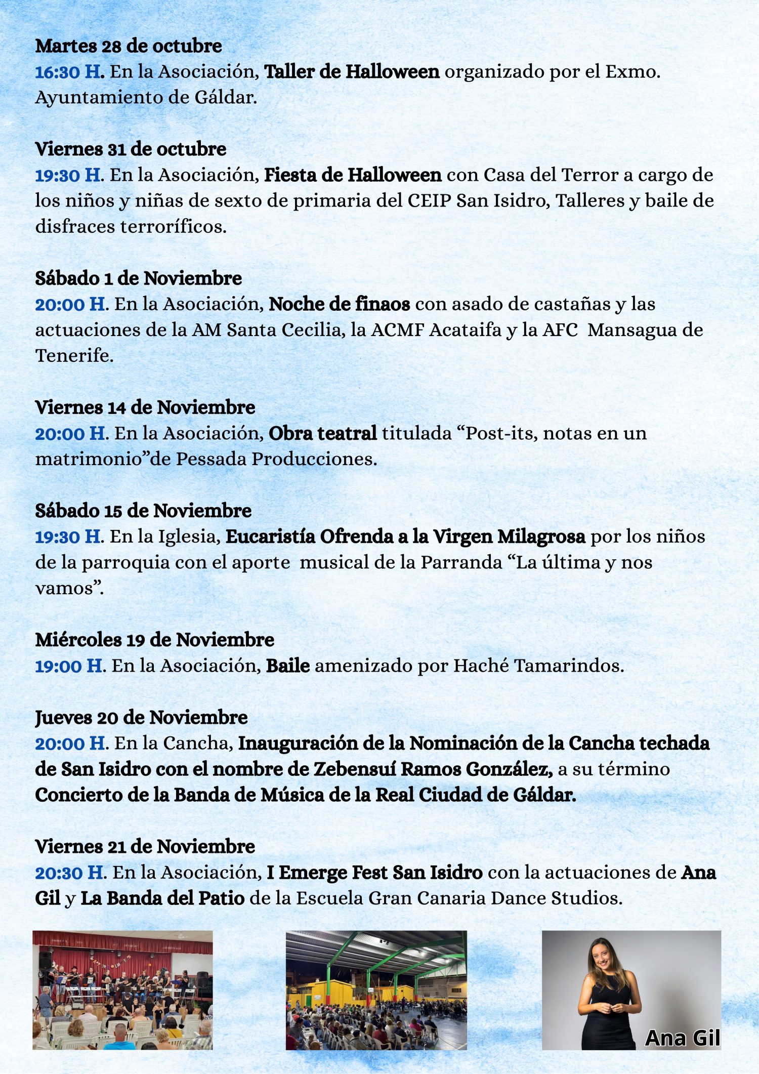 Conocidas como las Fiestas de noviembre, fiestas de la juventud y de la música, darán comienzo el martes 28 de octubre con un taller de Finaos y Halloween, y se prolongarán hasta el 30 de noviembre, fecha en la que se celebrará un taller de decoración de eventos. Durante todo este mes, la asociación propone una amplia variedad de actos para todas las edades y gustos.