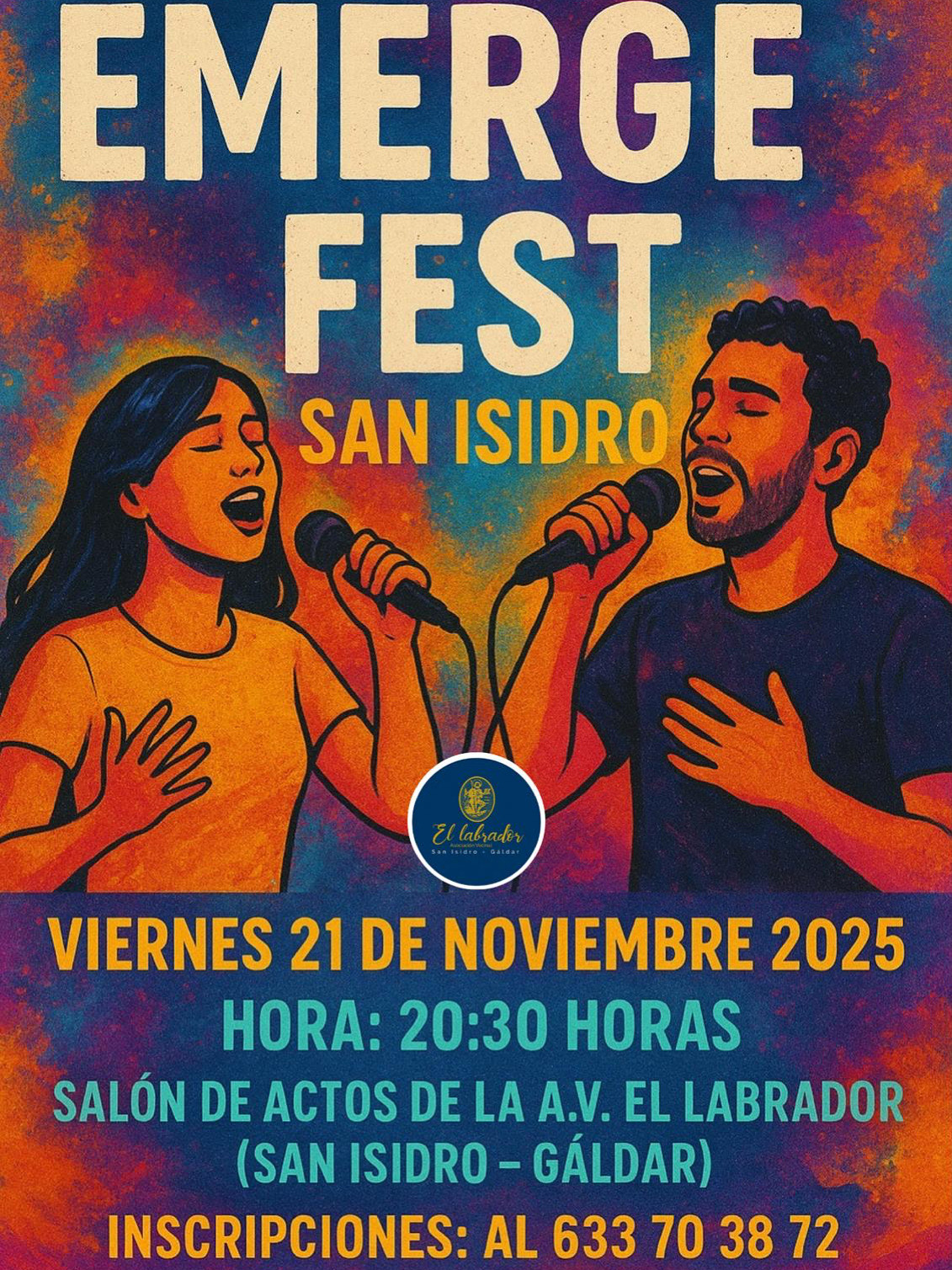 La Asociación de Vecinos El Labrador, en San Isidro (Gáldar), anuncia un evento musical innovador que promete llenar de ritmo y emoción el barrio: el EMERGE FEST San Isidro, que se celebrará el viernes 21 de noviembre de 2025, a las 20:30 horas, en el salón de actos de la propia asociación vecinal.