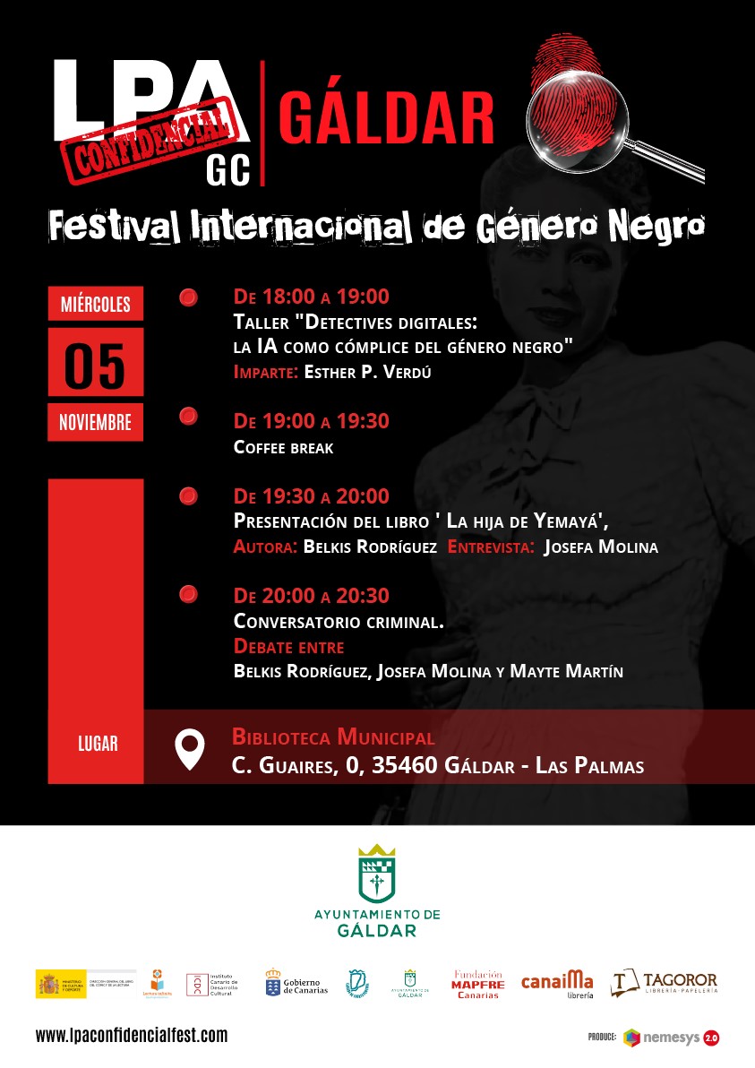 El Ayuntamiento de Gáldar acoge este miércoles 5 de noviembre una nueva cita con la literatura y el misterio con la quinta edición del Festival Internacional de Género Negro de Canarias, LPA Confidencial, que celebra por cuarta vez su edición en el municipio galdense. La jornada se desarrollará en la Biblioteca Municipal de Gáldar, adscrita a la Concejalía de Biblioteca, que dirige Carlos Ruiz Moreno.