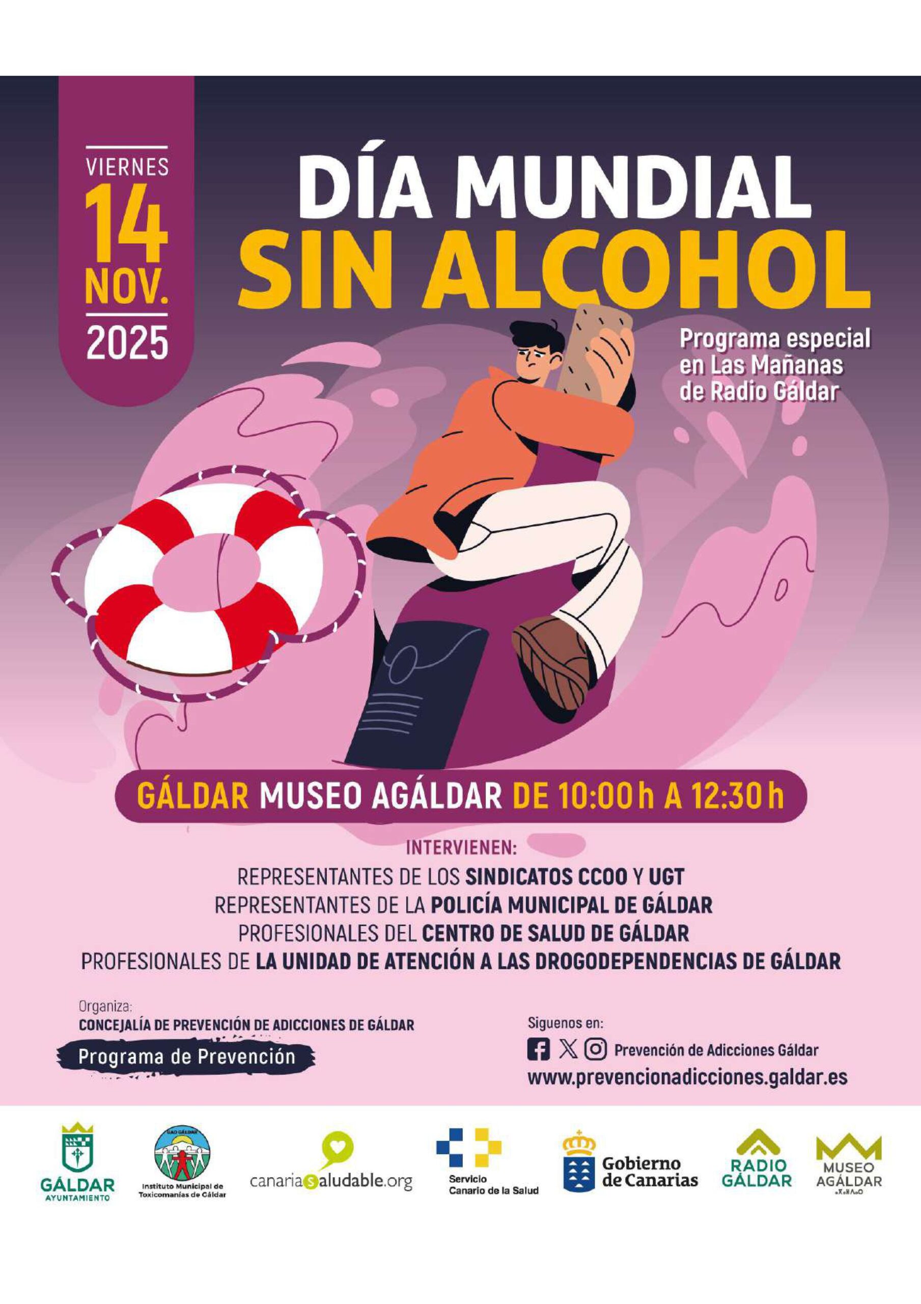La Concejalía de Prevención de Adicciones del Ayuntamiento de Gáldar celebra el Día Mundial sin Alcohol con una jornada especial, en colaboración con Radio Gáldar, la Concejalía de Policía Local, el Centro de Salud de Gáldar y los sindicatos CCOO y UGT. El acto se celebrará el viernes, 14 de noviembre de 2025, de 10.00 a 12.30 horas, en el Museo Agáldar de Historia de la Ciudad, y contará con la participación de agentes sociales, profesionales de la salud y representantes institucionales. El objetivo principal de esta jornada es reflexionar sobre el impacto del consumo de alcohol y promover estilos de vida más saludables en la comunidad galdense.