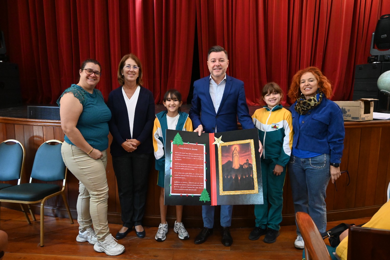 Un grupo de 18 estudiantes de 5º de Primaria del CEIP Alcalde Diego Trujillo protagonizaron esta mañana, un entrañable y simbólico acto en el Teatro Consistorial de Gáldar, con la entrega de su tarjeta navideña al alcalde, Teodoro Sosa Monzón.