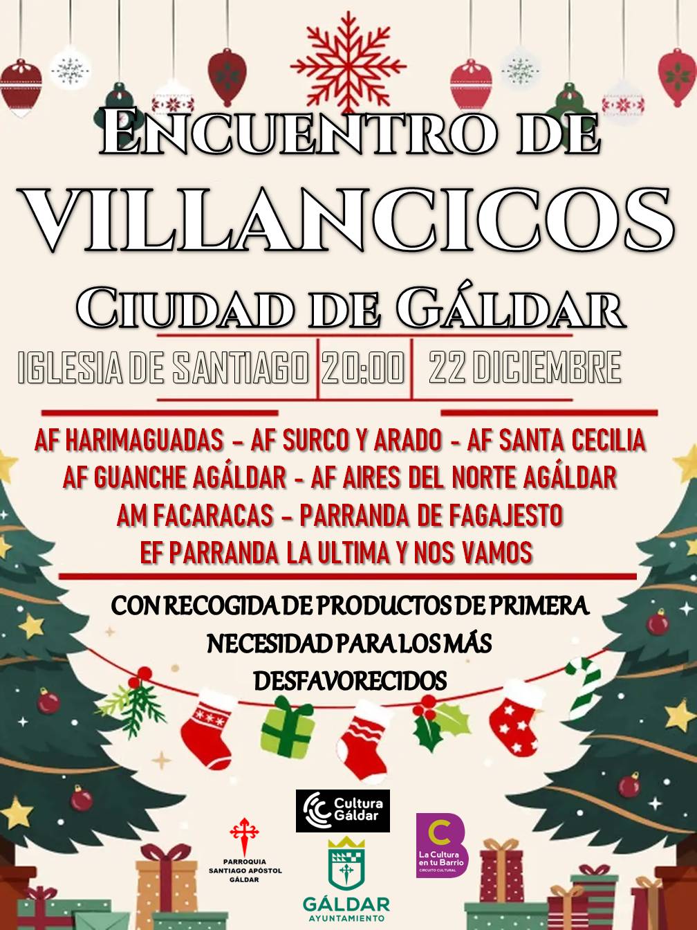 El Encuentro de Villancicos Ciudad de Gáldar regresa este año para llenar la Navidad de música, tradición y solidaridad. La cita es el lunes 22 de diciembre, a las 20:00 horas, en el Templo Santuario de Santiago Apóstol, un escenario inigualable que acogerá una velada llena de armonía, folclore y espíritu comunitario.