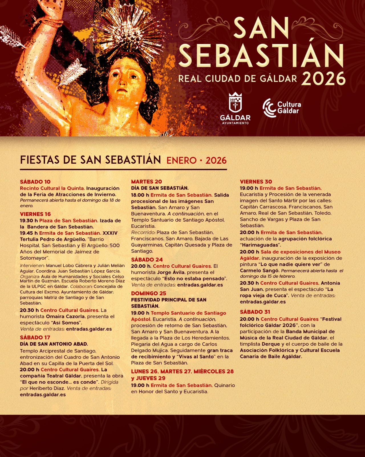 Gáldar celebra del 10 al 31 de enero, una programación cultural y religiosa llena de tradición, arte y folklore. Con un cartel que evoca la solemnidad y el fervor de la celebración, la Concejalía de Cultura y Fiestas del Ayuntamiento de Gáldar que dirige Julio Mateo Castillo, presenta una agenda que combina devoción, historia local, humor y expresiones artísticas.