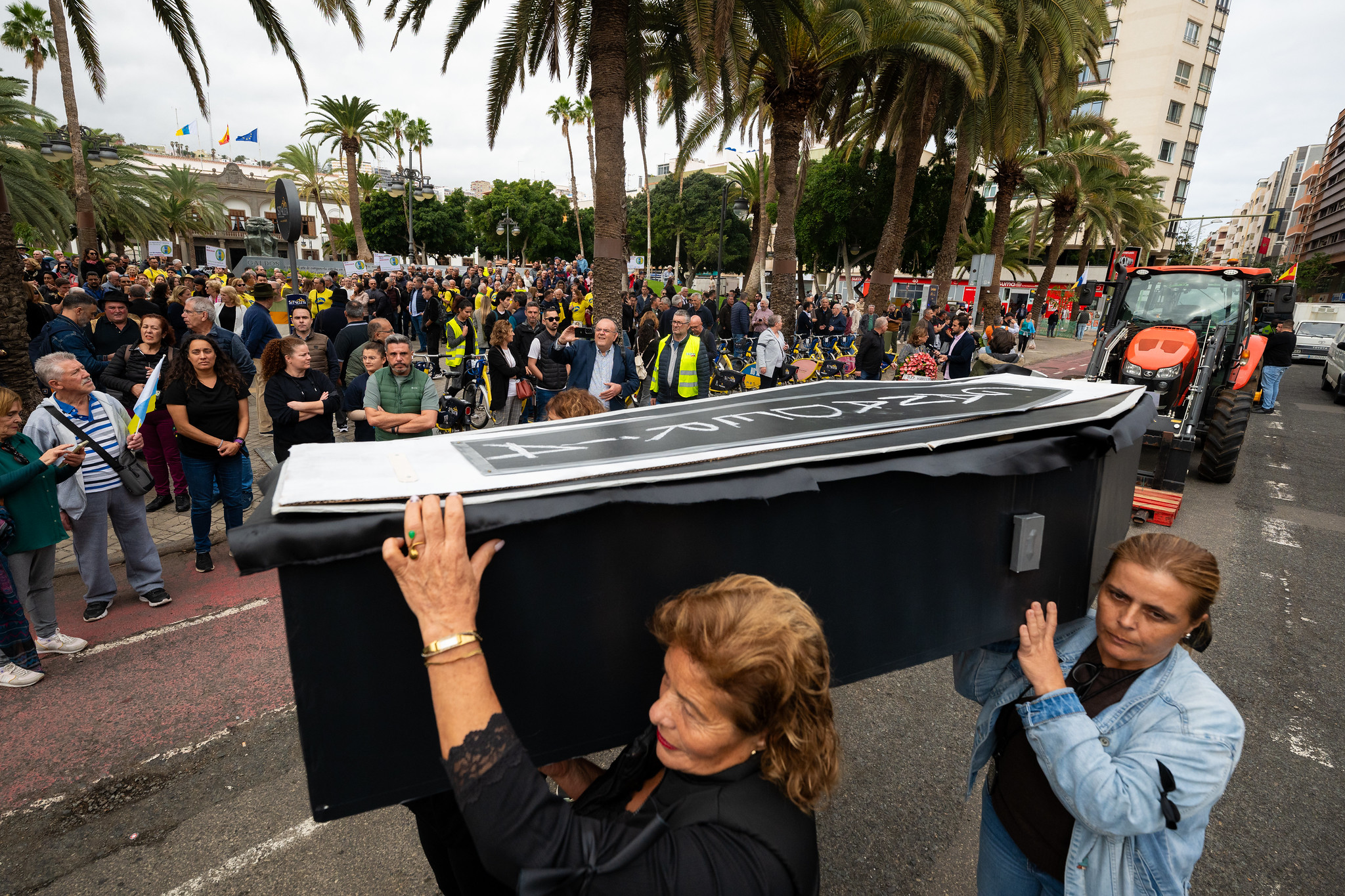 La movilización estuvo cargada de un simbolismo que advirtió sobre el riesgo de extinción del sector primario. Tres ataúdes representaron la muerte anunciada de la agricultura, la ganadería y la pesca, pilares históricos del tejido productivo canario. Los féretros fueron transportados hasta la plaza de la Feria a bordo de tractores que avanzaron en solemne procesión por la Avenida Marítima, evocando un cortejo fúnebre. El mensaje «Nuestro entierro, tu hambre», plasmado en las pancartas, condensaba la advertencia de que la desaparición del campo local acarreará la pérdida de soberanía alimentaria, enterrando metafóricamente décadas de trabajo en las medianías y cumbres de la isla, y exigiendo a las instituciones que detengan lo que el sector considera la estocada final a un modo de vida ancestral.
