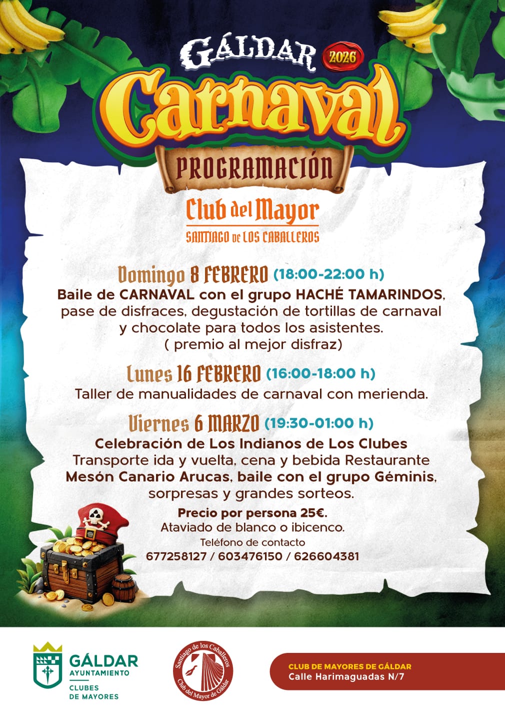 En el Club de Mayores de Gáldar, el domingo 8 de febrero, de 18:00 a 22:00 horas, tendrá lugar un gran baile de Carnaval con la actuación del grupo Haché Tamarindos, acompañado de degustación de tortillas de carnaval, chocolate caliente, sorpresas, rifas y premios al mejor disfraz. Las actividades continuarán el lunes 16 de febrero, de 16:00 a 18:00 horas, con un taller de manualidades temáticas y merienda.