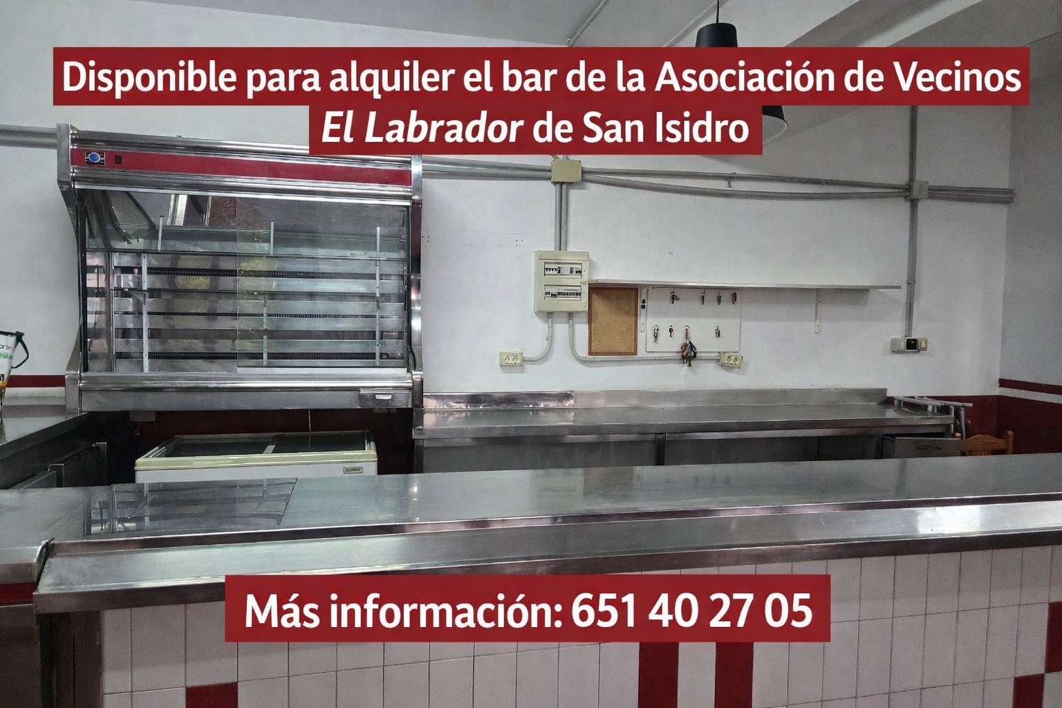 La Asociación de Vecinos El Labrador de San Isidro informa de que su bar se encuentra actualmente disponible para su alquiler. El espacio está preparado para actividad de hostelería y resulta ideal para personas interesadas en gestionar un bar en un entorno vecinal y consolidado.