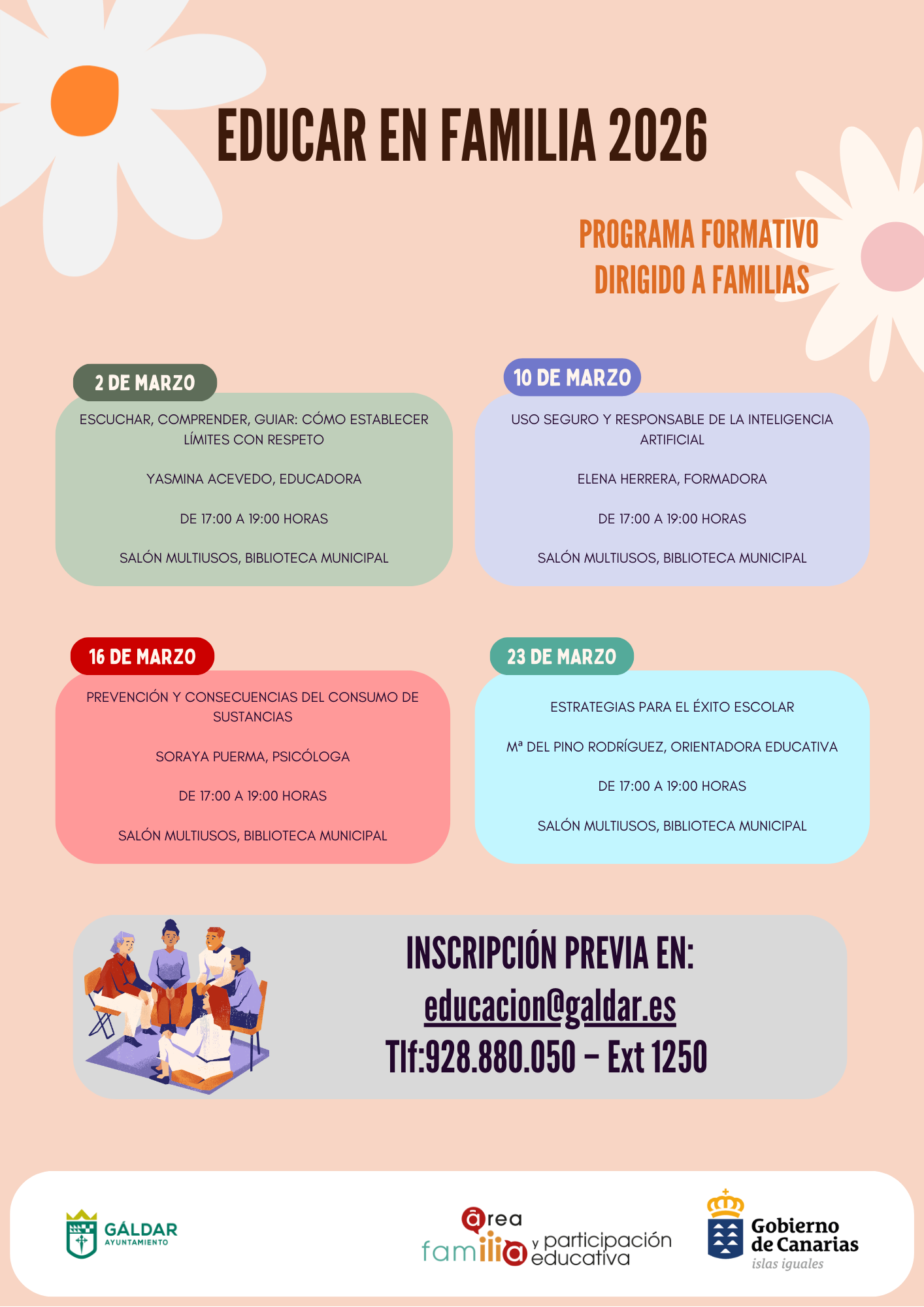 El Ayuntamiento de Gáldar a través de la Concejalía de Educación que dirige Rita Cabrera, ha puesto en marcha una colaboración con la Consejería de Educación, Formación Profesional, Actividad Física y Deportes del Gobierno de Canarias, concretamente, mediante su Área de Familia y Participación Educativa, para desarrollar el programa ‘Educar en Familia 2026’. Esta iniciativa, organizada y financiada íntegramente por la Consejería, busca ofrecer formación presencial a las familias galdenses mediante un ciclo de charlas y talleres impartidos por profesionales especializados, con el fin de fortalecer los vínculos familiares y proporcionar herramientas educativas prácticas y actualizadas.