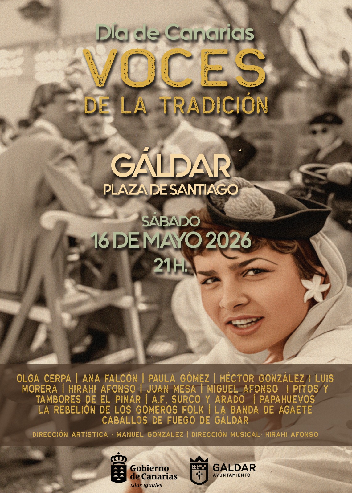 Gáldar arranca por todo lo alto su programa de actos con motivo del Día de Canarias con “Voces de la Tradición”, un espectáculo que reúne a algunas de las voces y manifestaciones festivas más relevantes de la música popular del archipiélago y que tendrá lugar el próximo sábado 16 de mayo a partir de las 21:00h en la Plaza de Santiago con entrada gratuita hasta completar aforo.