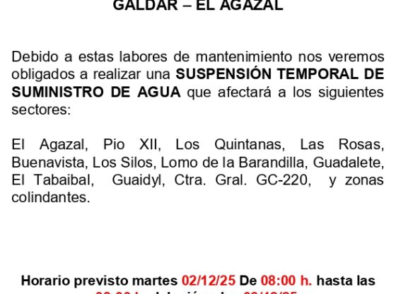 La empresa Aqualia, concesionaria del servicio de agua de abasto en el municipio de Gáldar, comunica que debido a trabajos de mejora en la red…
